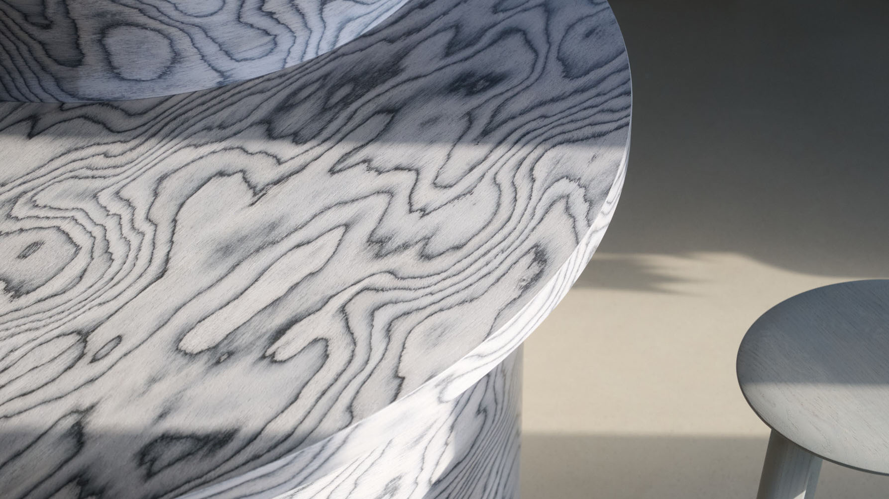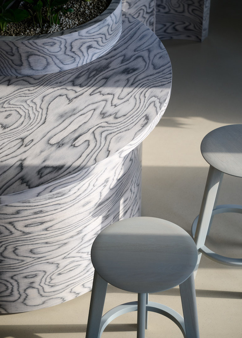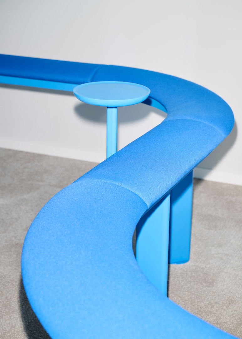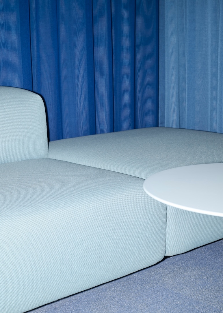 Flexible, eigens entwickelte Wellenmodule dienen als Sitzgelegenheiten, Theken oder kleine Bühnen. In Kombination mit einer raumgreifenden Akustikinstallation in Wellenform entsteht ein visuelles und funktionales Spannungsfeld zwischen Boden und Decke, das die Weite der Räume aufgreift und emotional auflädt.