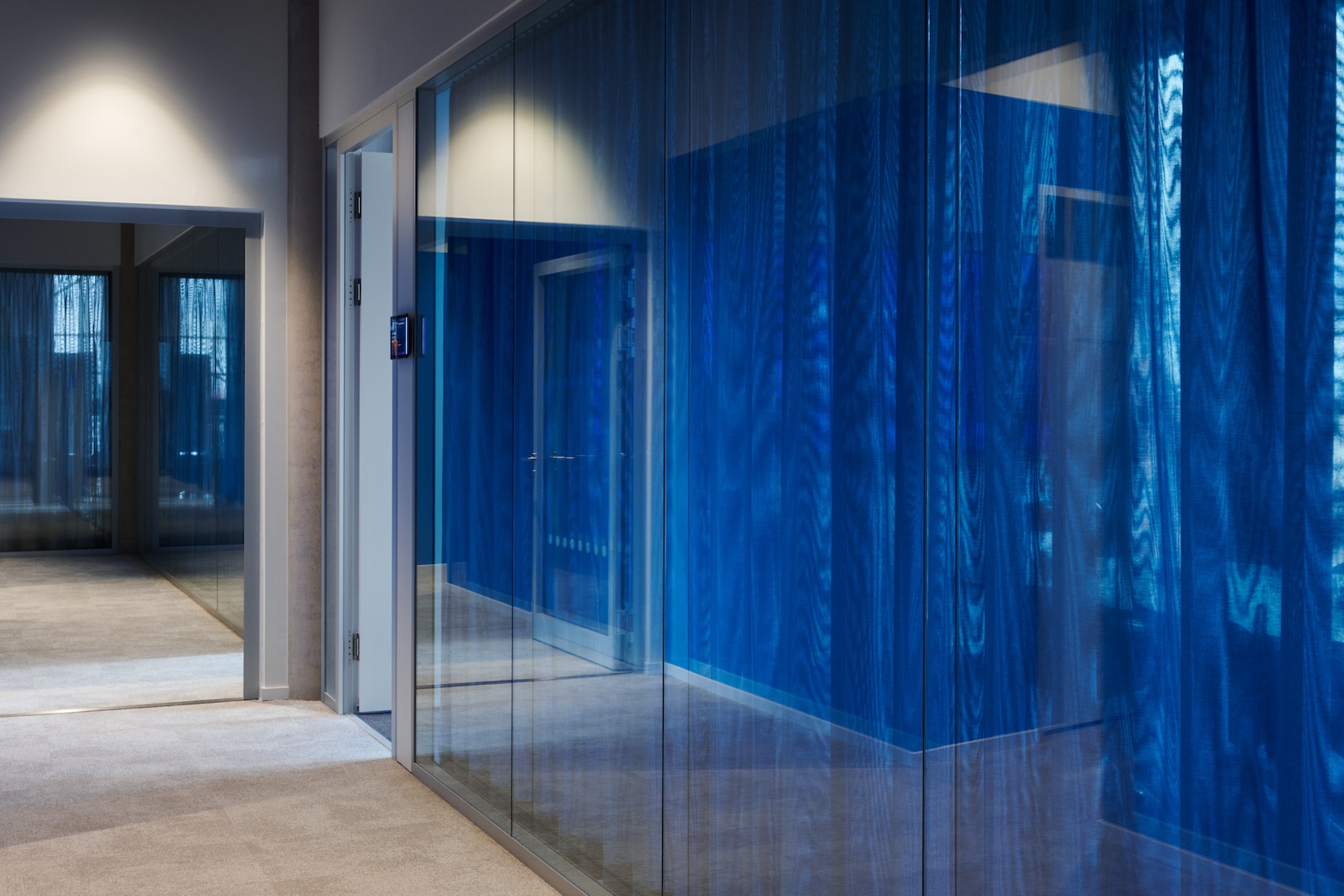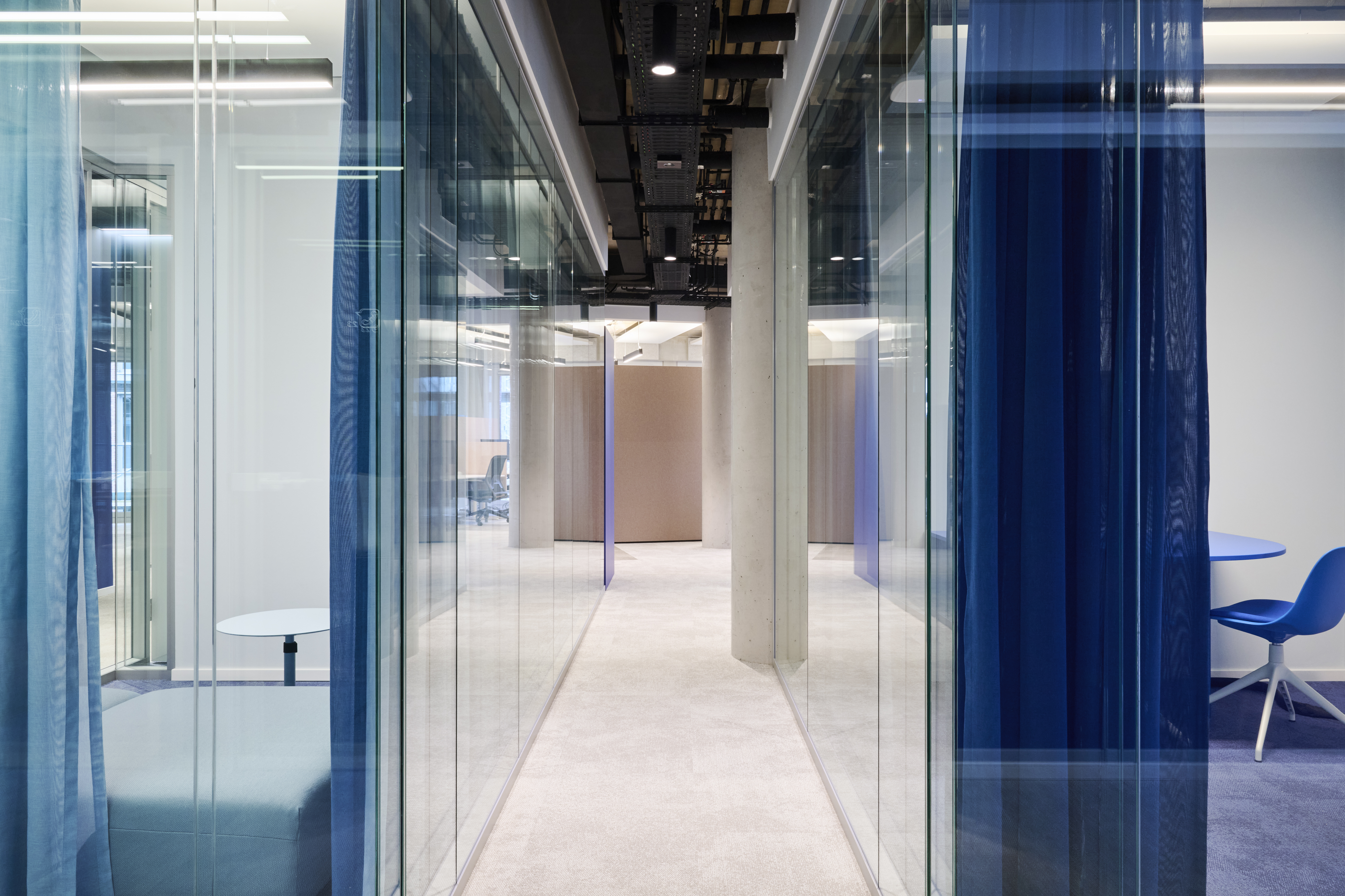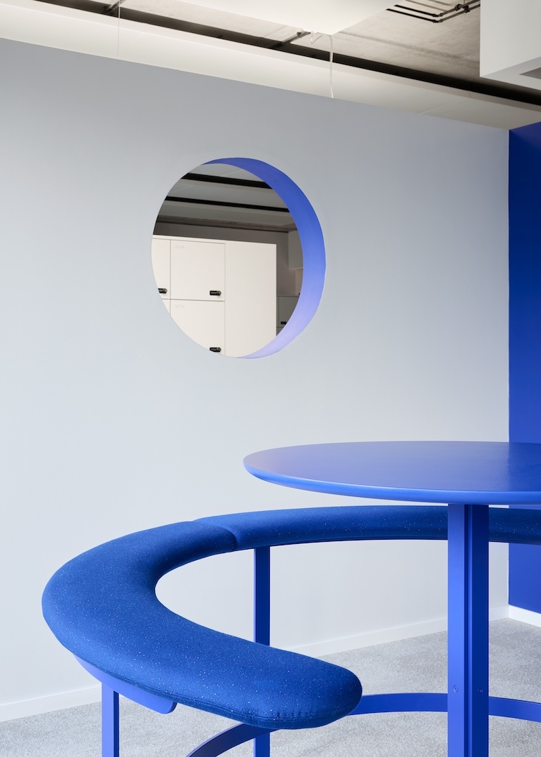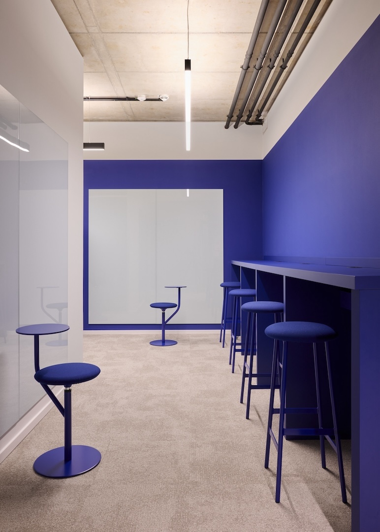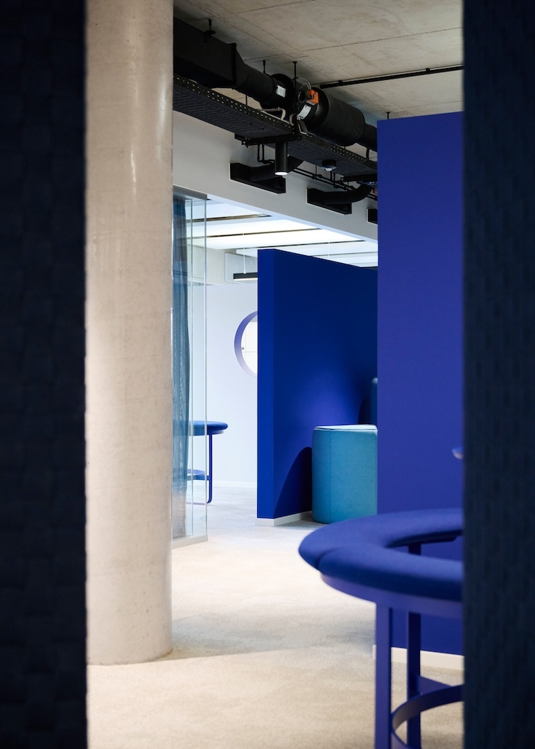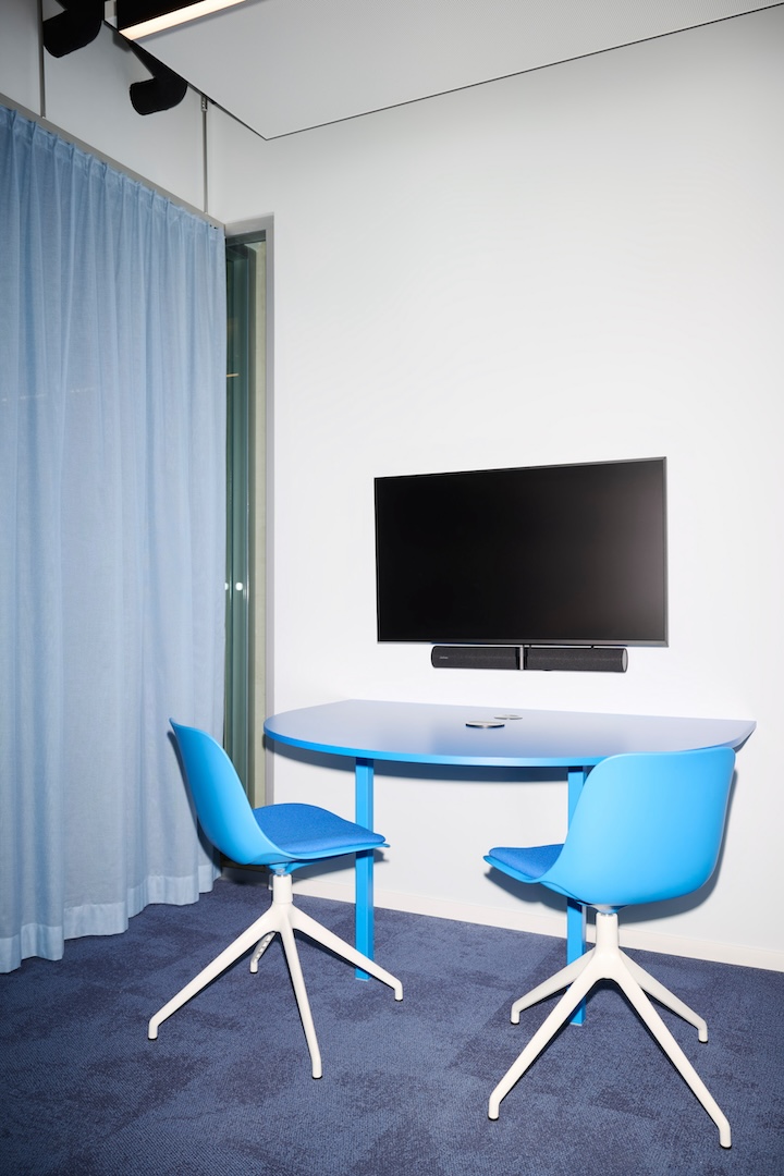 Unter dem gestalterischen Leitmotiv „Netzwerk“ wurden die CI-Blautöne von O₂ Telefónica bewusst plakativ eingesetzt: Vorhänge, Wände und Bodenbeläge bilden Farbflächen, welche durch monochrome Möbel ergänzt werden. Durch Wandöffnungen und transluzente Flächen entstehen spannende Blickachsen und Sichtbezüge, sodass aus jedem Blickwinkel – im Sinne eines Perspektivwechsels – ein neuer Raumeindruck entsteht.