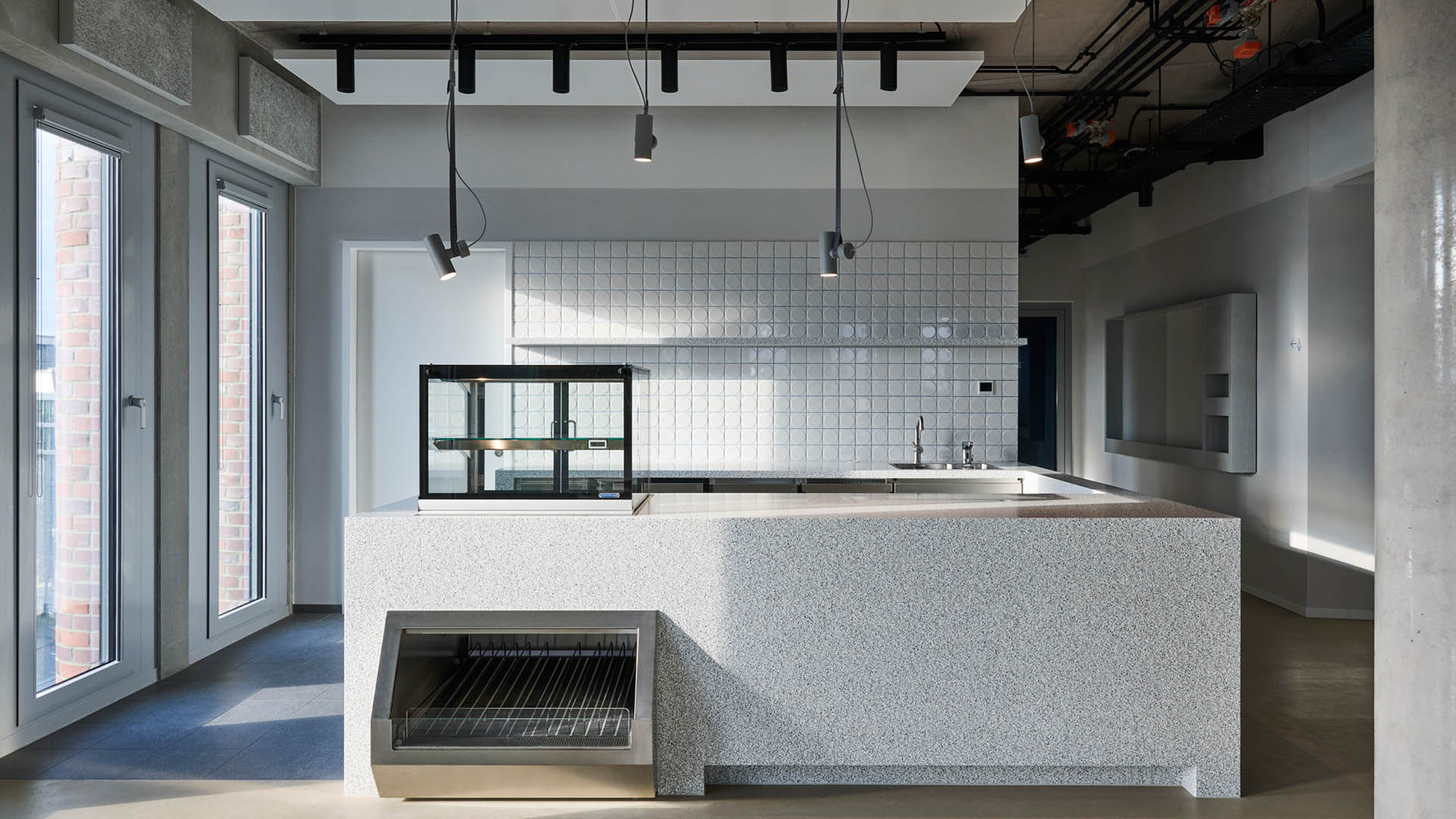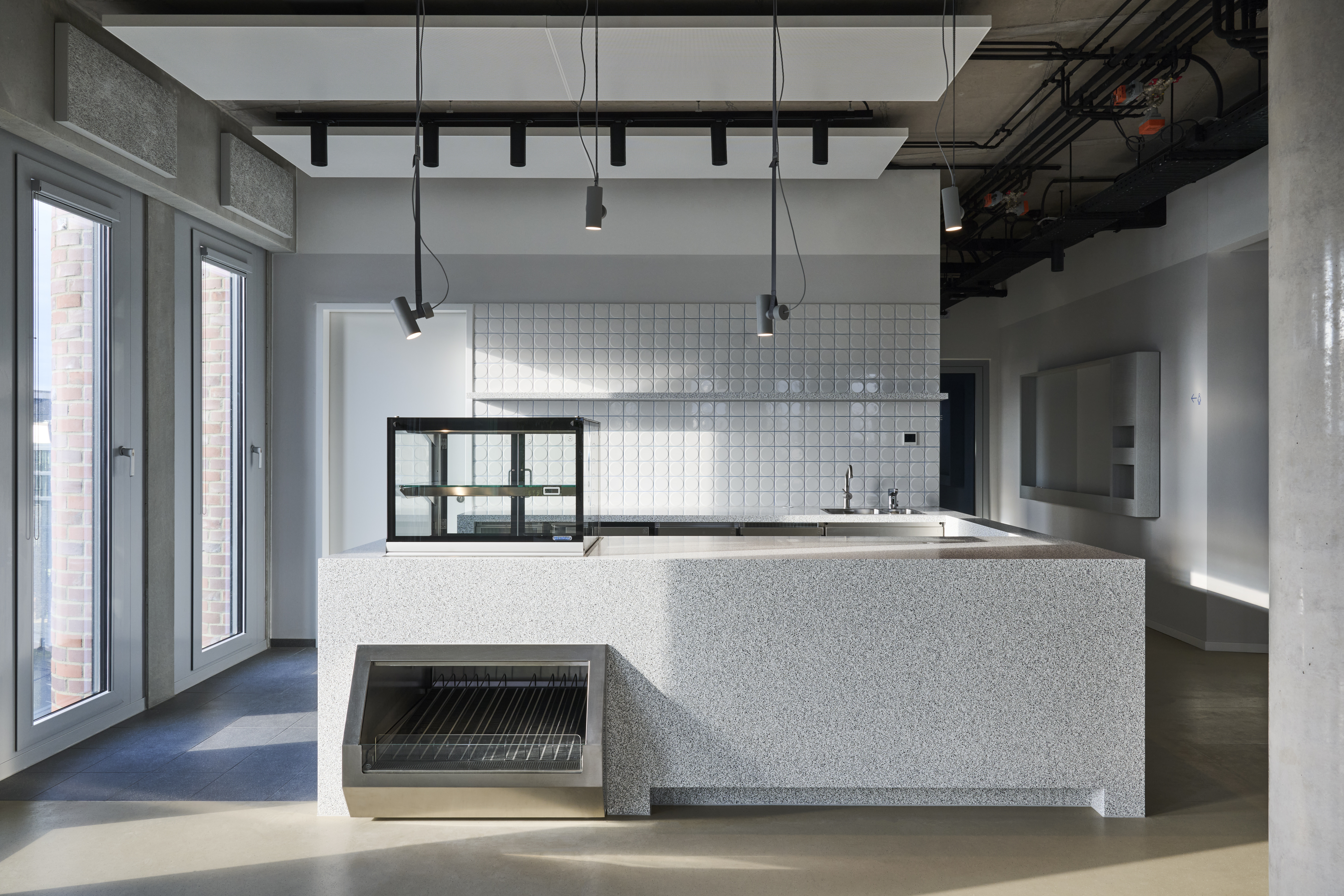 Sichtbeton, metallische Oberflächen und kranartige Regalsysteme geben diesen Bereichen eine funktionale Robustheit und verankern das Gebäude sinnbildlich am Wasser.