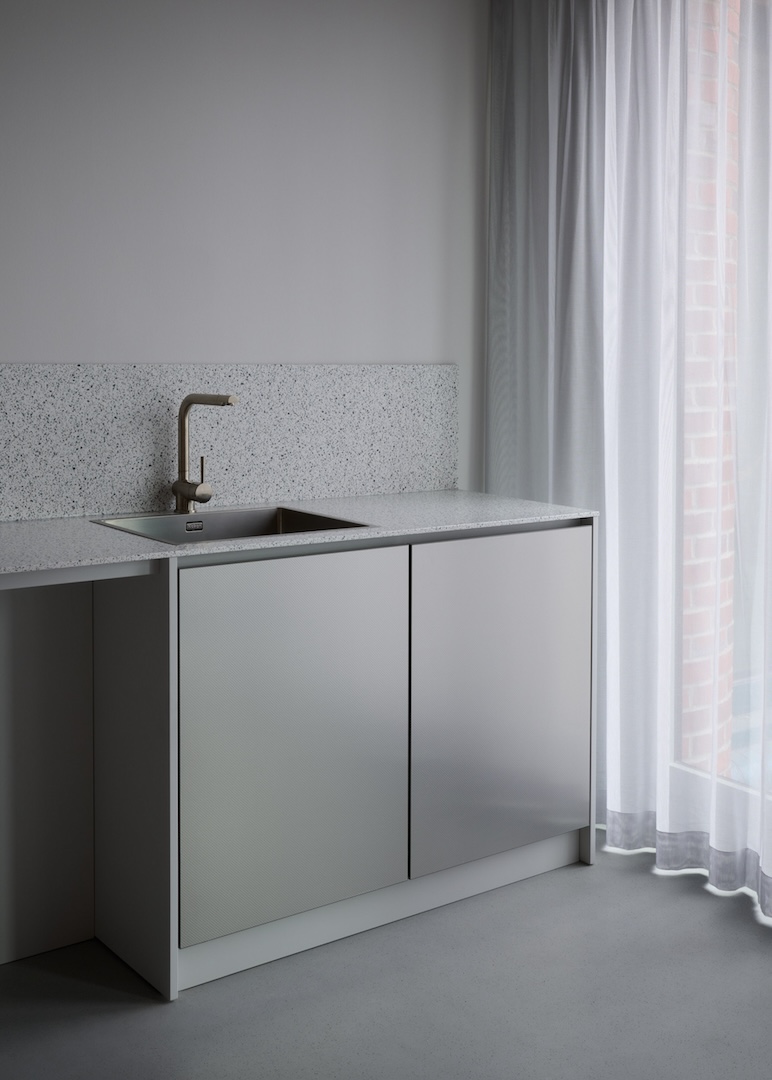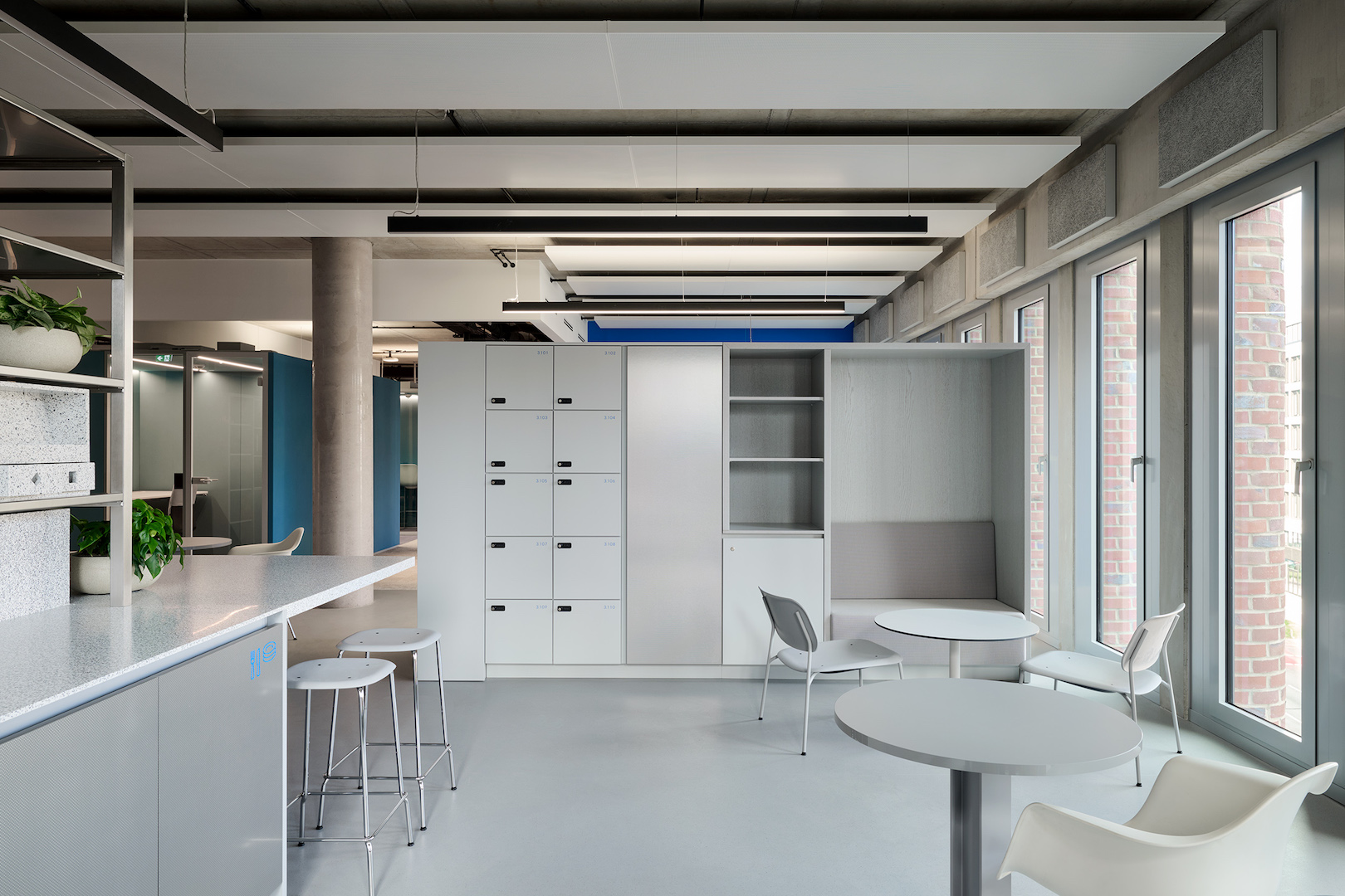 In Erweiterung der Flurzone werden Druckstation, Ablage, Spinde und Rückzugs- bzw. Besprechungseinheiten miteinander vereint.