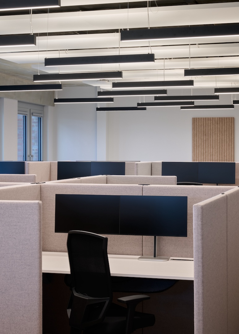 Akustisch wirksame Rückzugsräume, ermöglichen sich aus dem lebendigen Arbeitsumfeld zurückzuziehen um konzentriert und ungestört zu arbeiten. Durch bewusst eingesetzte Oberflächen entsteht eine gedämpfte Akustik, die Ruhe und Klarheit fördert.