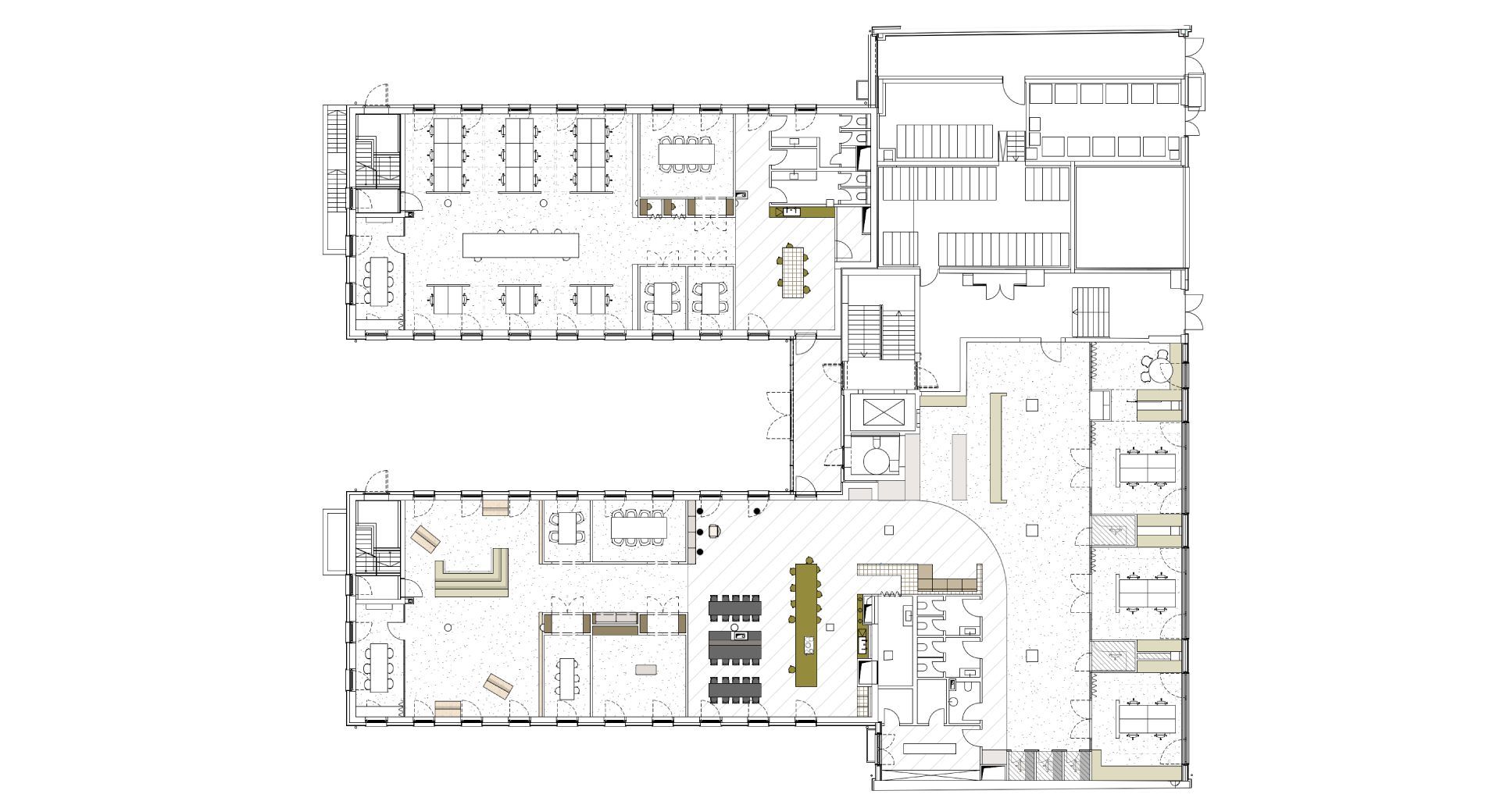 Die Tatsache, dass Unternehmensberater die meiste Zeit beim Kunden verbringen, bedeutet keineswegs geringere Anforderungen an ihren Arbeitsplatz. Im Gegenteil, es erfordert ein hohes Maß an Flexibilität. Der Grundriss umfasst daher nur wenige Teambüros mit festen Mitarbeiterplätzen. Stattdessen liegt ein besonderes Augenmerk auf einladenden New-Work-Bereichen mit Arbeitsinseln, die sich den wechselnden Anforderungen der Mitarbeitenden anpassen können. Unser Entwurfskonzept umfasst ein gezieltes Office-Interior-Design, das das soziale Leben in der Unternehmensberatung im Innenraum widerspiegelt und einen gestalterisch fließenden Übergang zwischen Alt- und Neubau schafft.