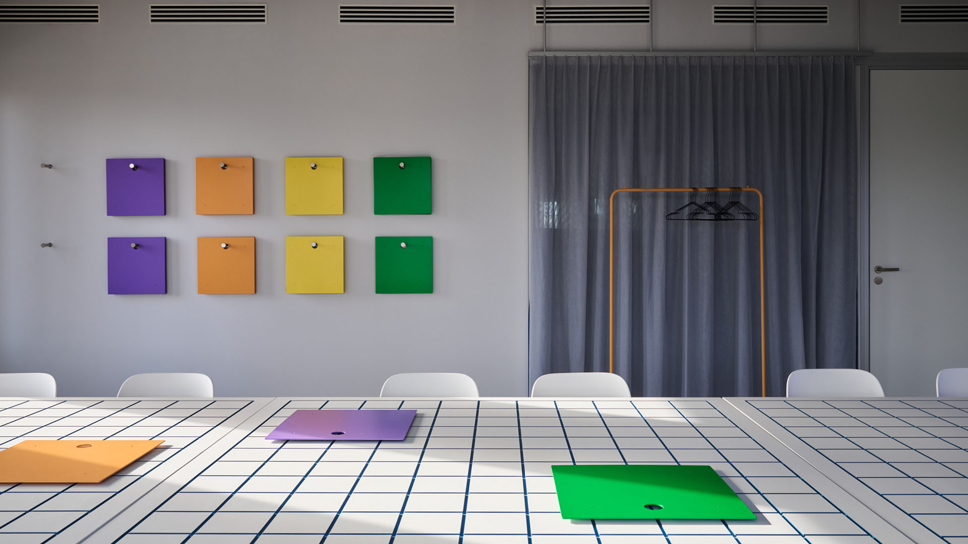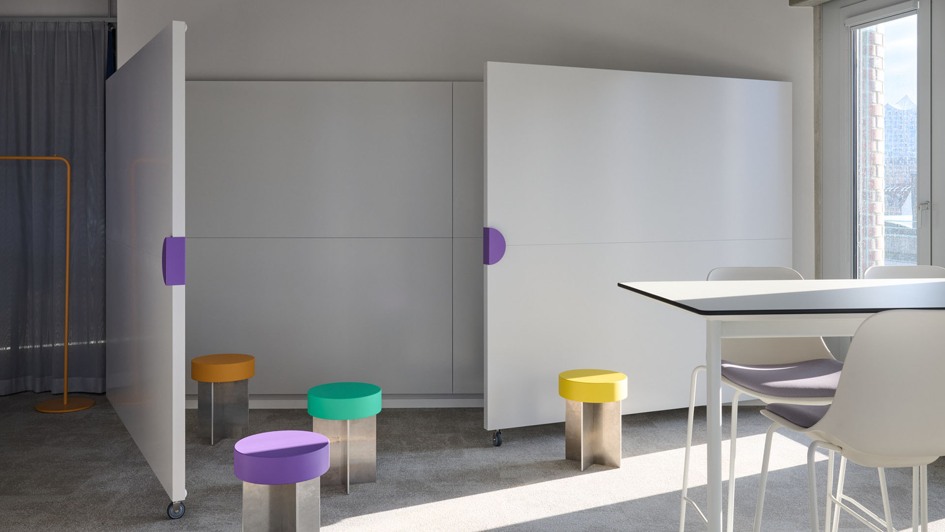 Je nach Ausstattung eignen sie sich als Projekträume, Trainingsräume, Vortragsräume oder Meetingräume für größere Gruppen. In den markenspezifischen Akzentfarben werden alle Objekte hervorgehoben, welche im Raum veränderbar und bewegbar sind.