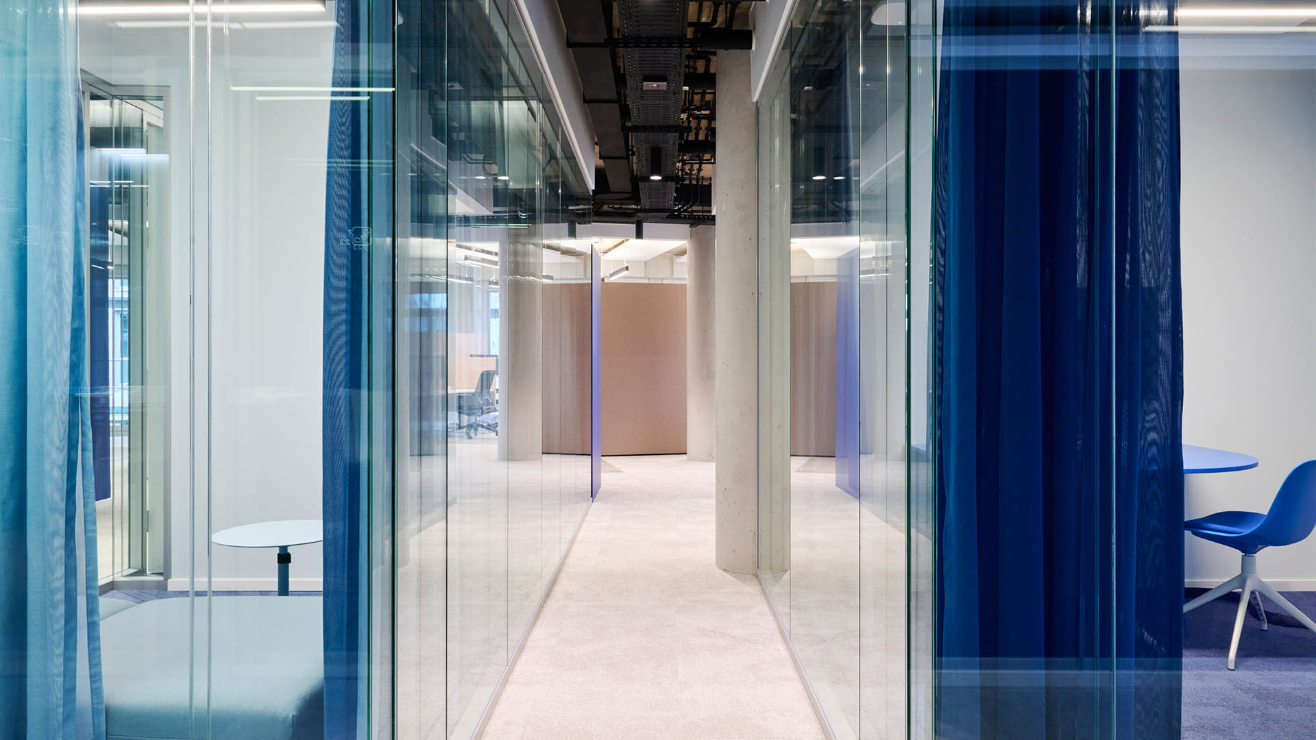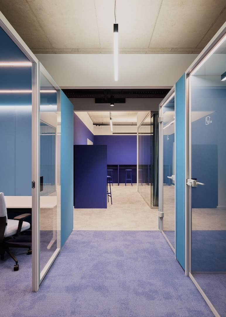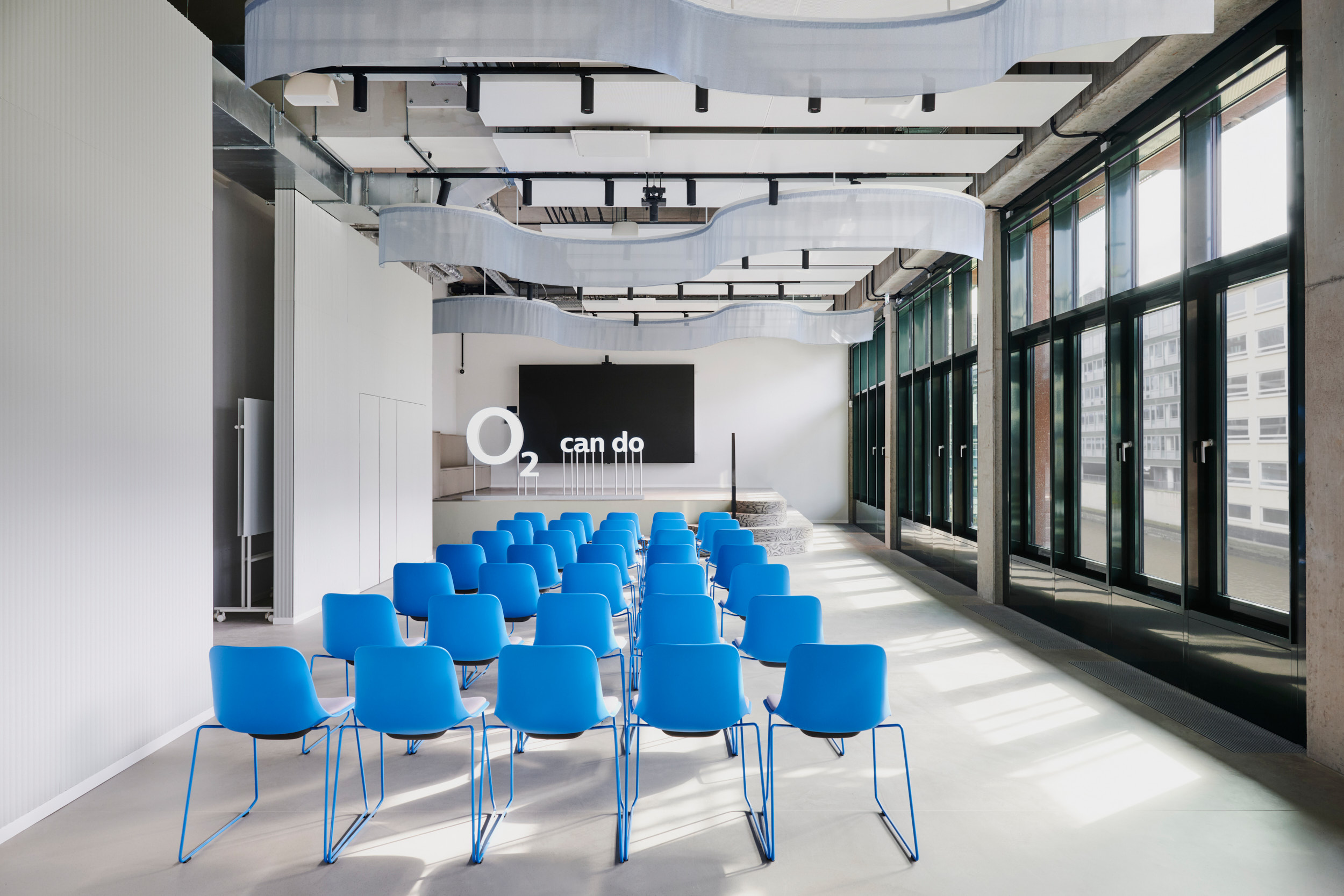 Unter dem gestalterischen Leitmotiv „Netzwerk“ wurden die CI-Blautöne von O₂ Telefónica bewusst plakativ eingesetzt: Vorhänge, Wände und Bodenbeläge bilden Farbflächen, welche durch monochrome Möbel ergänzt werden. Durch Wandöffnungen und transluzente Flächen entstehen spannende Blickachsen und Sichtbezüge, sodass aus jedem Blickwinkel – im Sinne eines Perspektivwechsels – ein neuer Raumeindruck entsteht.