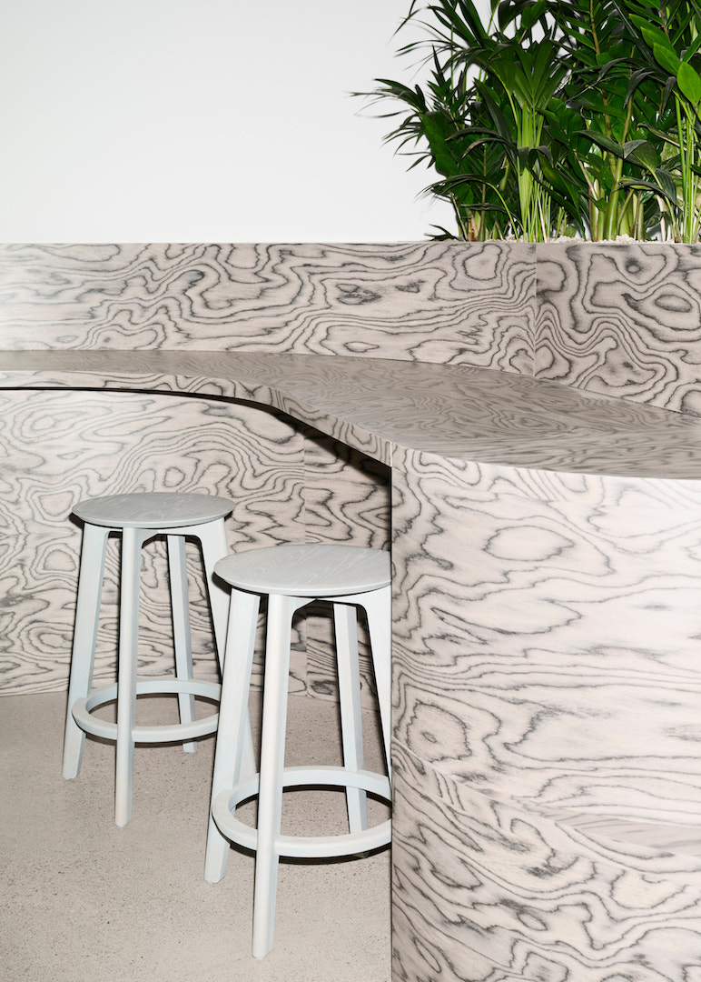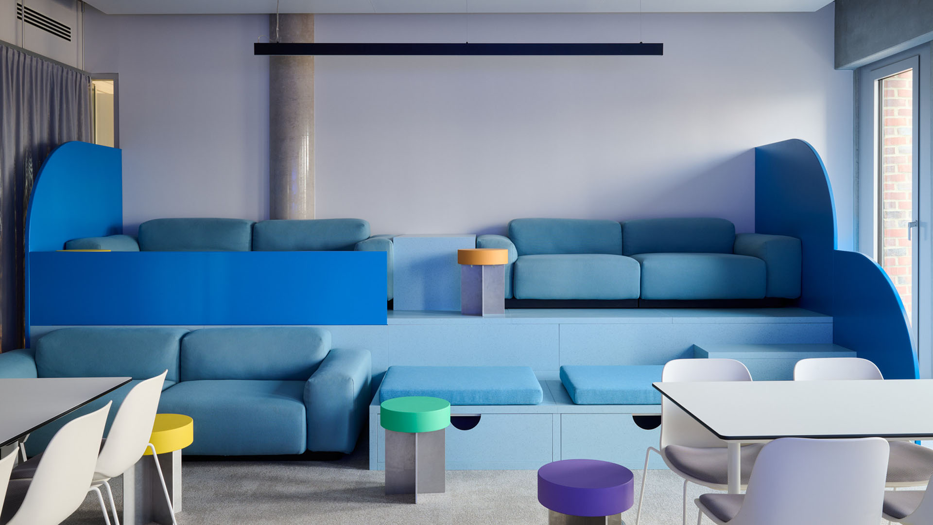 Flexible, eigens entwickelte Wellenmodule dienen als Sitzgelegenheiten, Theken oder kleine Bühnen. In Kombination mit einer raumgreifenden Akustikinstallation in Wellenform entsteht ein visuelles und funktionales Spannungsfeld zwischen Boden und Decke, das die Weite der Räume aufgreift und emotional auflädt.