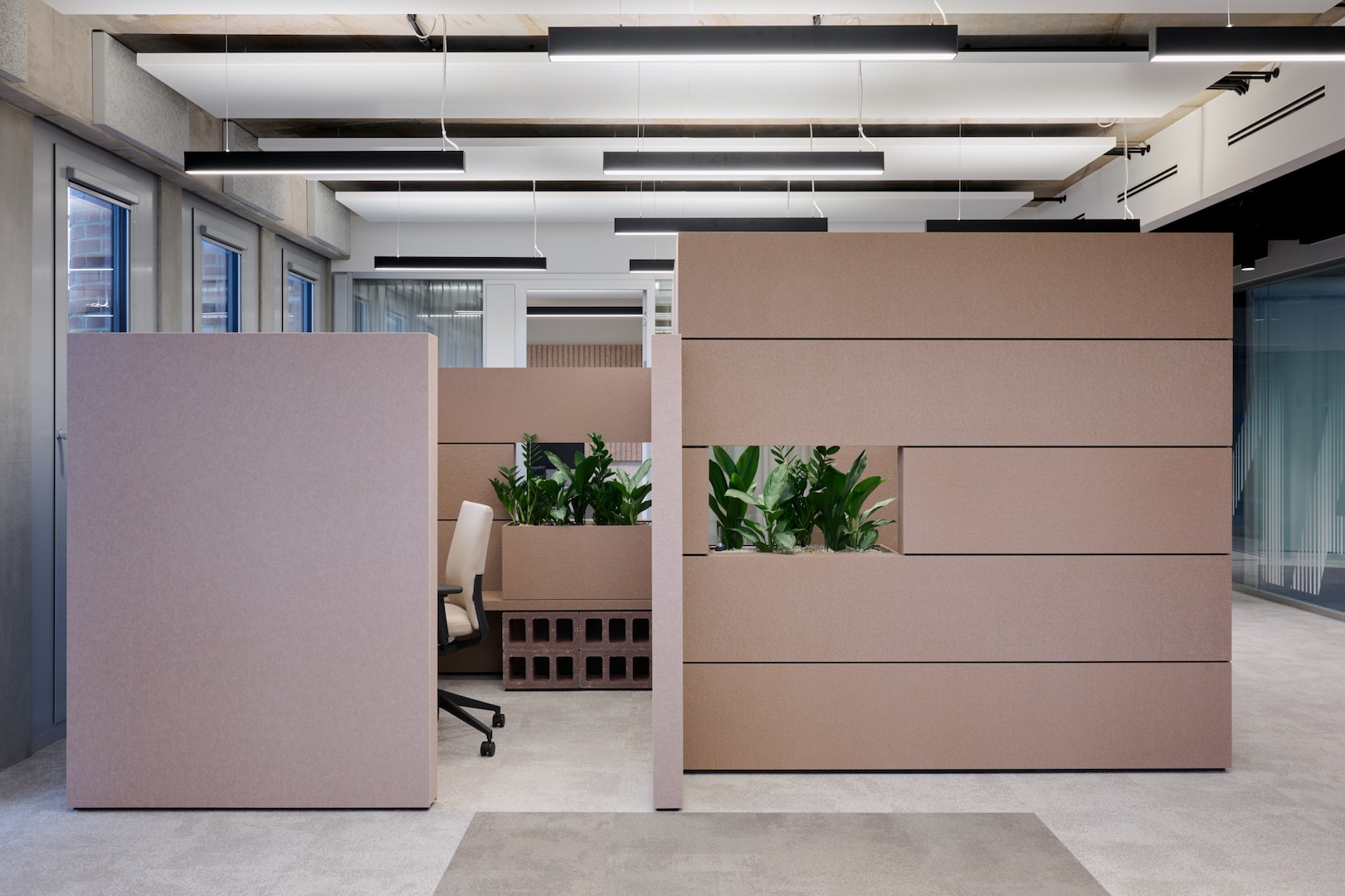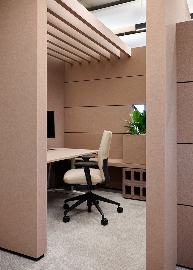 Akustisch wirksame Rückzugsräume, ermöglichen sich aus dem lebendigen Arbeitsumfeld zurückzuziehen um konzentriert und ungestört zu arbeiten. Durch bewusst eingesetzte Oberflächen entsteht eine gedämpfte Akustik, die Ruhe und Klarheit fördert.